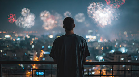 View from behind a solitary young man standing on a balcony or rooftop railing, looking out over a densely populated city at night while colorful, bright aerial explosions create a stunning light display in the sky above the blurred cityscape lights.
