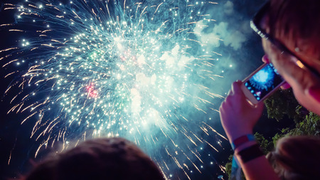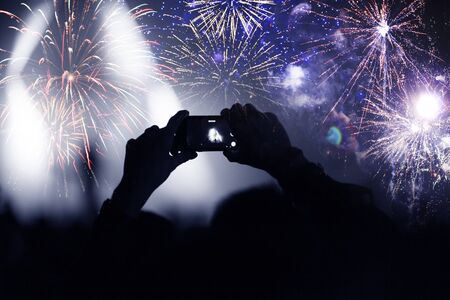 Group of people watching fireworks and using cellphones to record event. People capturing a fireworks shows with their mobile phone. Colorful fireworks celebration and the night sky background
