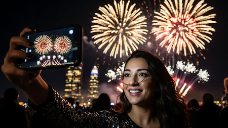 Beautiful woman taking selfie with mobile phone at New Year Eve party