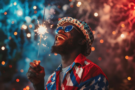 Exuberant man in American flag attire enjoying Fourth of July fireworks with a sparkler AI