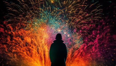 One person standing in nature, celebrating with exploding fireworks generated by artificial intelligence