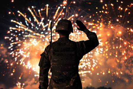 A soldier salutes the flag while fireworks light up the sky in the background, A silhouette of a soldier saluting against a backdrop of fireworks