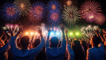 A silhouetted crowd with raised hands watches a vibrant fireworks display explode in a colorful night sky with clouds.