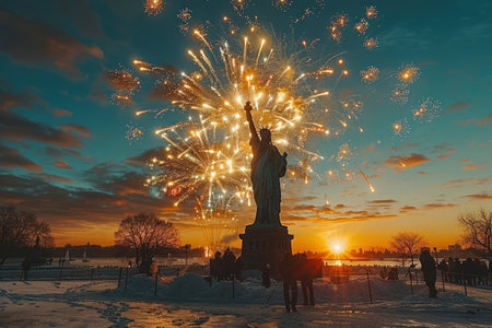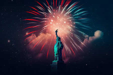 Spectacular pyrotechnics light up the sky above the iconic Statue of Liberty painting the night with vibrant colors and sparkling glitter