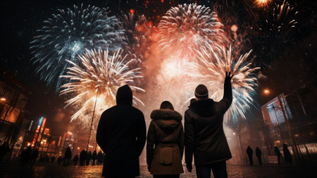 Happy people looking up to the sky with firework in new year 2024 night celebrate happy new year festival 2024 comeliness.