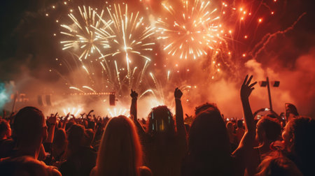 Large crowd cheers with champagne under fireworks. A vibrant scene of mass celebration on New Years Eve. Perfect for event advertising, holiday promotions, and public festivity concepts.