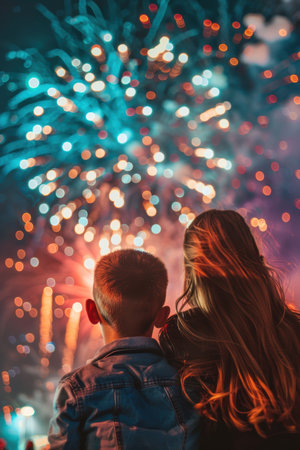 Children sitting on their parents' shoulders gaze at a dazzling fireworks display in the night sky, the excitement and joy of an independence day celebration. bright colors illuminate the scene, creating a festive atmosphere.