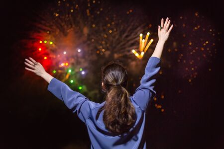 A young brunette woman enjoys the fireworks in the sky.Concept of festivals and holidays with fireworks. The view from the back.
