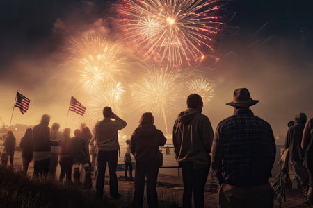 Peoples in silhouette enjoy watching amazing firework show in a festival or holiday. Happy Fourth of July. America Independence Day greeting banner template of people watching fireworks. AI generative