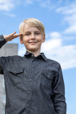 A young handsome man salutes while wearing a black shirt, showing confidence and style.