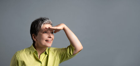 interested 50s elderly woman with short gray hair looks into distance on gray background. search for good offer concept.
