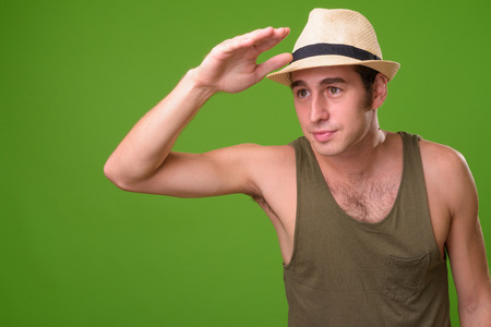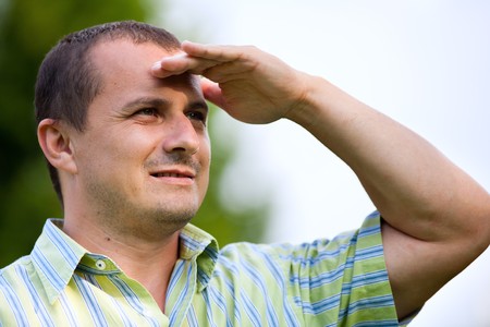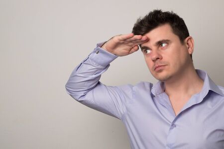 Handsome guy looking into the distance, holding his hand near his eyes, isolated on white background