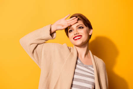 Hipster bearded guy in beanie hat and checkered shirt holding hand over eyes looking long distance with attentive view, future perspectives. studio shot isolated on yellow background