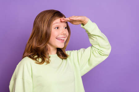 Profile side photo of young cheerful girl happy positive smile look ahead isolated over violet color background