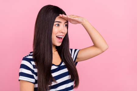 Profile photo of hooray young millennial lady look wear striped t-shirt isolated on pastel pink color background