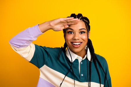 Smiling young woman in colorful casual shirt saluting against a yellow background, expressing positivity and confidence