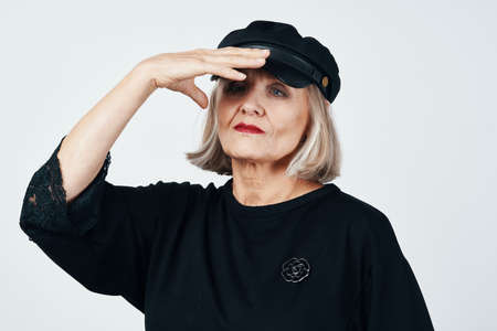 Attractive bearded man in hat and suit saluting studio shot dark background.