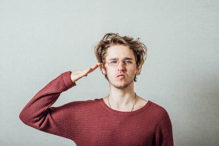 Friendly male adult model smiling as making hand to temple military salute greeting gesture wearing casual summer tshirt clothing fashionable stylish concept isolated on white studio background