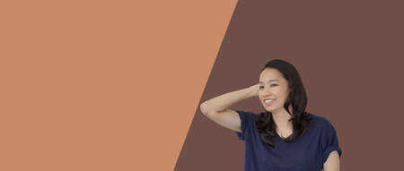 Southeast Asian girl woman long hai rsmile in casual tee shirt copy space