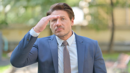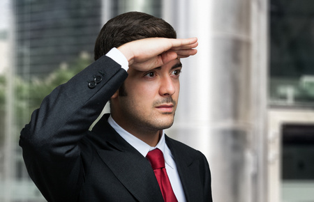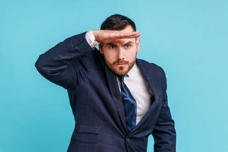 Far future. Portrait of handsome man wearing official style suit looking into distance, holding hand over eyes and watching horizon with attentive view. Indoor studio shot isolated on blue background.