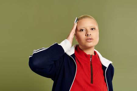 A young bald woman poses thoughtfully in vibrant attire against a green backdrop.