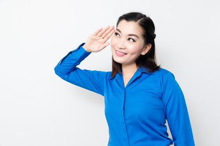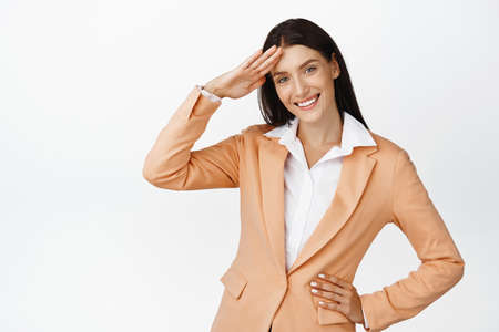 Happy attractive businesswoman saluting isolated on a white background. Looking at camera