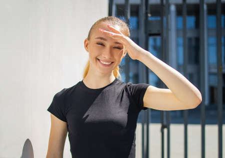 Happy joyful smiling woman spending her free time outside enjoying beautiful summertime weather looking at something in distance