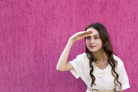 Portrait of a young beautiful woman looking far away with hand at her forehead.