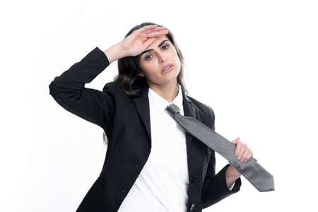 Tired business woman in suit and tie. Confident female entrepreneur. Female employee sad secretary. Portrait of attractive elegant fixing suit isolated on white background.