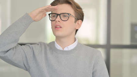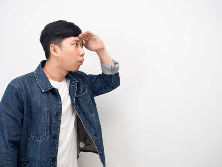 Young asian men look far ahead, frowning and search for something in distance or future concept