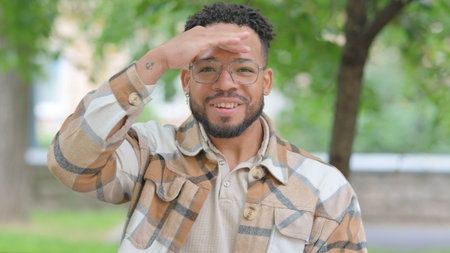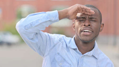 Smiling young african american guy in casual t-shirt posing isolated on yellow orange wall background. People lifestyle concept. Mock up copy space. Holding hand at forehead looking far away distance.