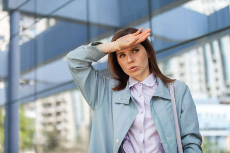a girl is in love young gorgeous lady is holding her hand near the forehead. she is full of dreams and fantasies