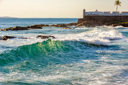 Salvador sea waves with an old colonial fortress from the empire era in the background during sunset.