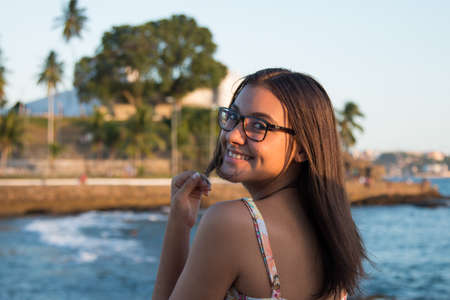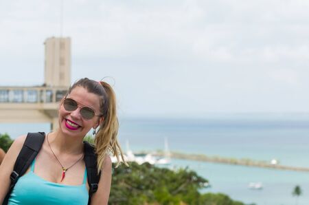 Tourism in Salvador de Bahia. Beautiful smiling girl visiting Pelourinho famous historic center of Salvador de Bahia, Brazil.