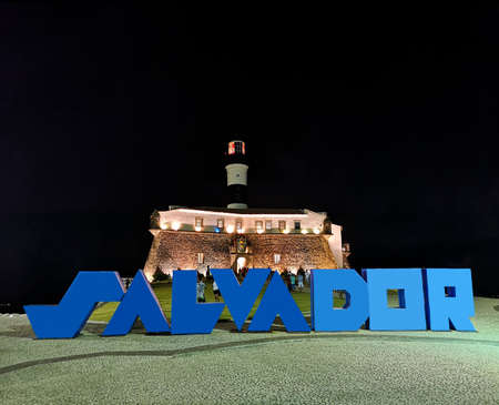 Night view of Barra Lighthouse with the name Salvador in the city of Salvador, Bahia, Brazil.