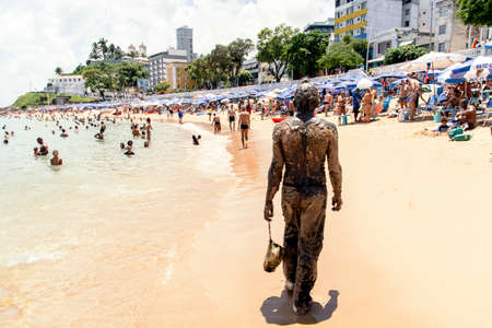 Man performs theatrical performance of Garlic and Oil on the Porto da Barra beach in Salvador. People on the beach watch his performance. Salvador Bahia Brazil.