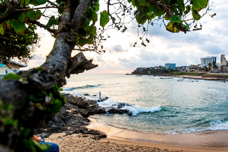 Salvador, Bahia, Brazil - June 06, 2021; Beautiful colorful sunset with clouds on the Rio Vermelho beach in Salvador, Bahia.