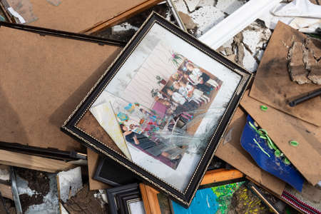 MAKARIV, UKRAINE - Apr. 23, 2022: Destroyed kindergarten as a result of the invasion of Ukraine by the Russian occupation forces. Russians throw air bomb on it at night on March 26