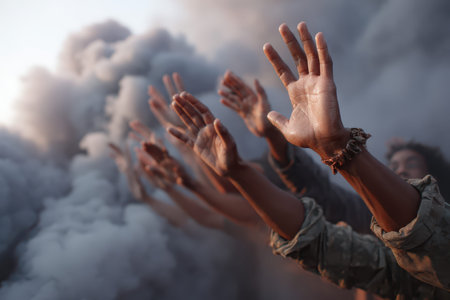 Hands of determination raised against a backdrop of smoke in a powerful expression of resistance during an intense moment of conflict