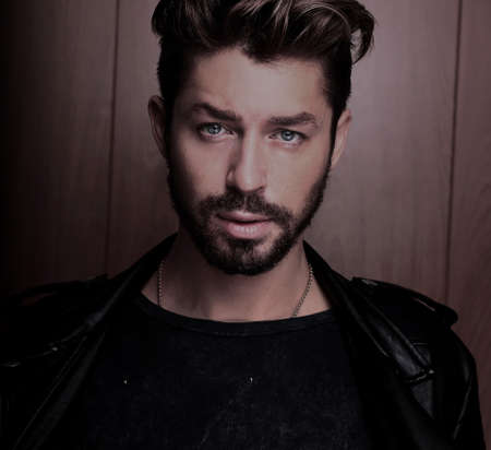 A large portrait of a stylish young man with a beard and dark hair in a black leather jacket with faux fur collar.