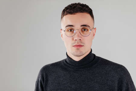 Portrait of a young man wearing a black T-shirt. A man in a black classic sweater on a black background. The dark-haired young man. An enigmatic look.