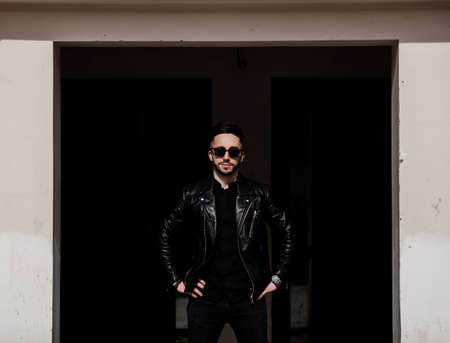 handsome man with a stylish hairstyle in a leather jacket and sunglasses poses against the background of an urban wall