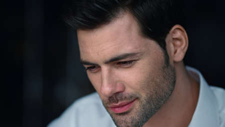 Closeup thoughtful man face looking in dark hotel room. Portrait of rich guy adjusting shirt collar indoors. Sexy man thinking and touching face in night office