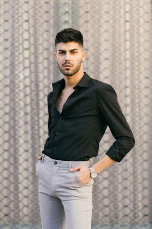 Handsome sexy and casual young man standing in front of wall. High resolution photo.