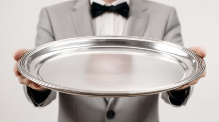 a professional waiter showcasing an empty silver tray. It's the essence of restaurant hospitality and service excellence.