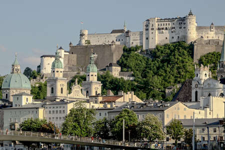 Sunset view from Salzach River in Salzburg, Austria. Famous Heritage Festung Hohensalzburg, Salzburger Land, Austria, Europe on 18.05.2016