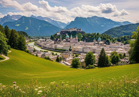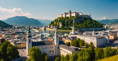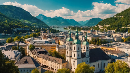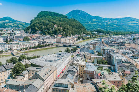Idyllic panoramic city landscape of Salzburg in Summer