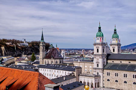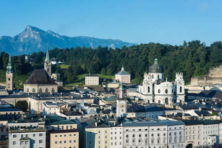 View of Salzburg, city of Mozart, iconic and historic center and old town from the Kapuzinerberg Hill