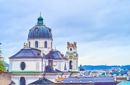 The view on the roof of Collegiate Church (Kollegienkirche) with its large dome and bell towers decorated with stone sculptures, Salzburg, Austria