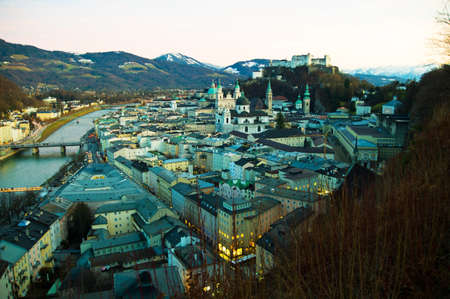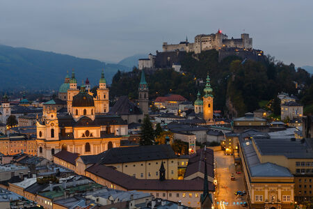 Twilight over the center of Salzburg lit with evening illumination of buildings